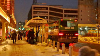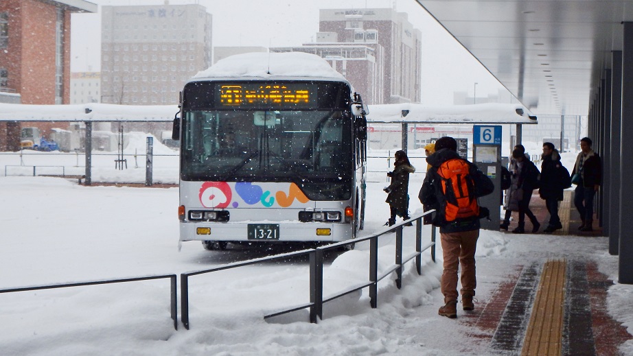 遅ればせながら列の最後尾に並ぶ。いや~これ乗れないだろ。周囲を見てもタクシーの姿はない。このバスに乗り遅れたら14時のスーパーカムイに乗れなくなる。これに乗れないと予定通りに苫小牧に着けない。それはすなわちフェリーに乗り遅れるということである。不安になりながら運転手氏に「これ全員乗れるんですか?」と聞くと「この後に臨時を出しますのでそれに乗ってください」とのこと。その臨時がいつ出るのかわからんが状況的に非常にやばい。13時に定期の便が出るとすぐさま臨時がやってきた。それに乗り込み座席を確保。この臨時便もみんなが乗ったらすぐに出発。「よかった~」と思うと同時に「渋滞してたらまずいな~」とも思う。さっきの定期便がまともに走って旭川駅着が13時41分。遅れは10分までだな。