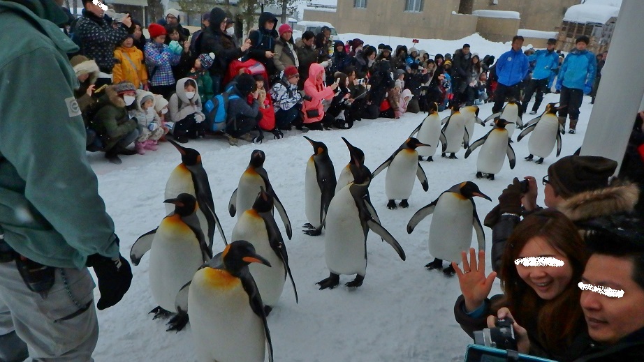 その後はオオカミとか昨日間近で見れなかったエゾジカとかヘビとかカエルとかレッサーパンダとか地味なものを見てから本日のメインイベント、ペンギンの散歩を見に行く。