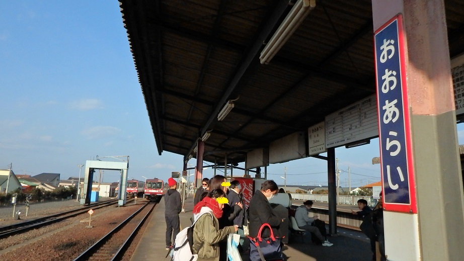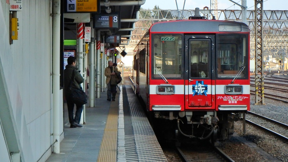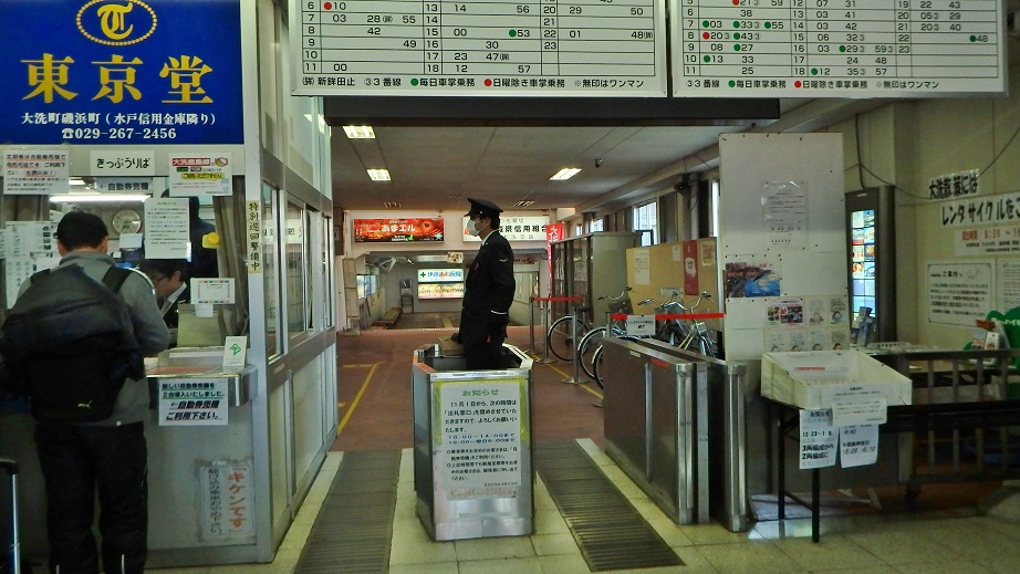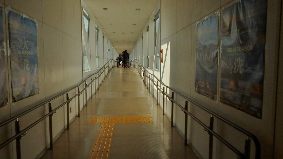 フェリーターミナルを出るとものすごい数の行列ができていた。「これ、大洗駅行きの行列ですか?」と聞くと「水戸行きです」との答えが。そんなバスもあったのか。調査不足だ。だとすれば僕らが乗る大洗駅行きのバスはどこから出るんだ???フェリーターミナルの案内所で聞いてみるも例の行列だと教えられる。水戸行きと大洗駅行きの2つの行列がごっちゃになってるんだな。しかしこんなに並んでたら座れないかもしれない。僕はいいとして特に下のチビは厳しそうだ。というわけで目の前に停まっていたタクシーに大洗駅までどれくらい(お値段)かかるか聞いてみると「720円」とのお答えが。おぉなんだ、ワンメーターで行けるのか。というわけでタクシーで大洗駅に向かうことにした。