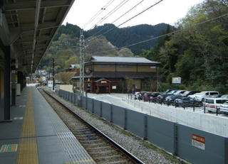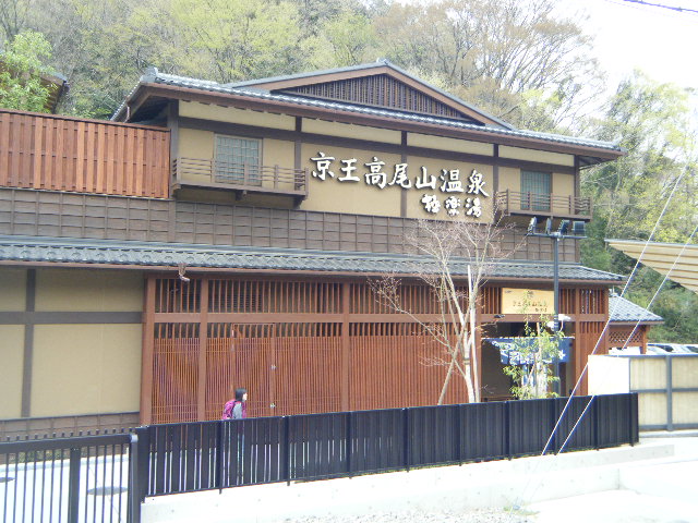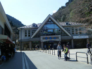 高尾山口のホームにて。「ん???なんだあの温泉チックな建物は???」