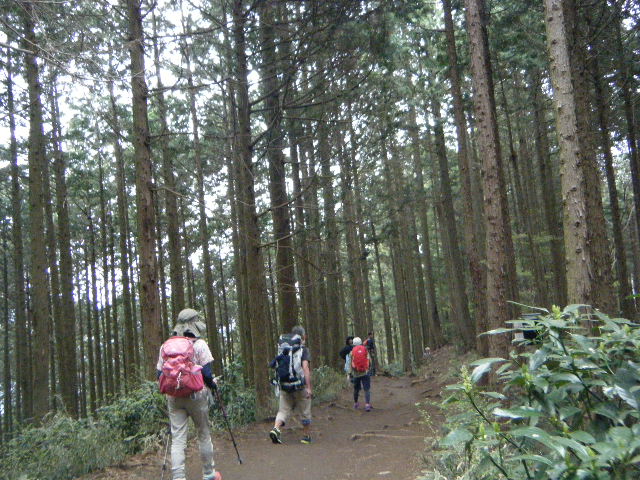 ほとんどの人がこちら側に向かって歩いてくる中15時54分、ビジターセンターとの分岐に到着。時間がないので今回は山頂をパスして城山方面へと向かう。ぽつりぽつりしか歩いていない(しかもこちら方向)中を城山に向かい歩く。空模様が怪しい。なんかめっちゃ雨が降りそうだ。雨具は持ってきたが傘はない。スパッツもない・・・。