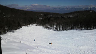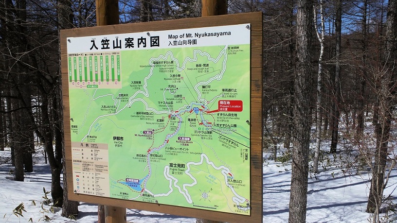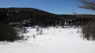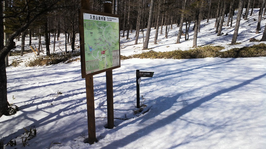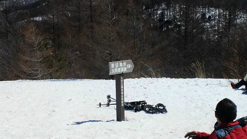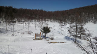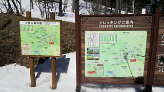 地図無しなのでトイレの前にある看板というかルート図をみる。するとあの雪の斜面を登ってもゴンドラ乗り場に戻れる模様。あそこに見える鉄塔を目指すような感じなのか???せっかくなんで帰りは違うルートにしてみよう。