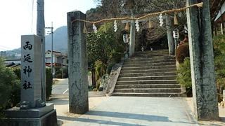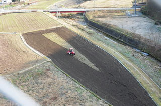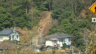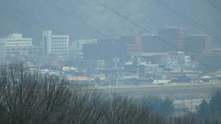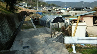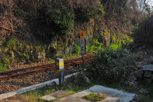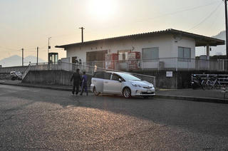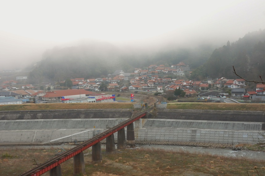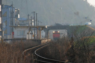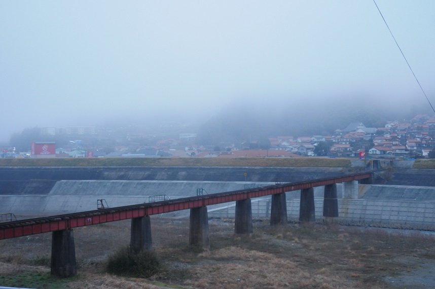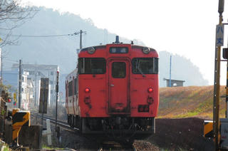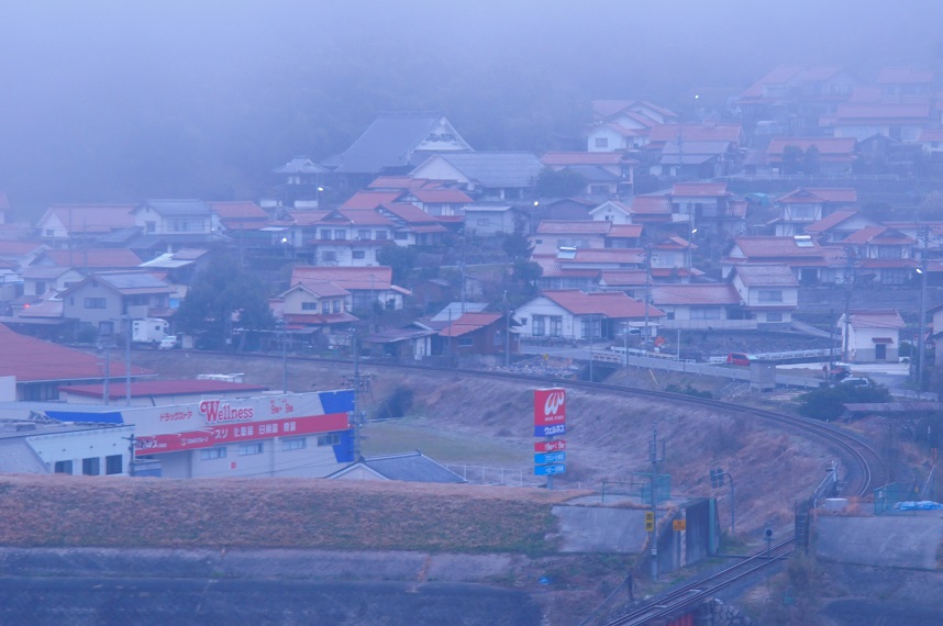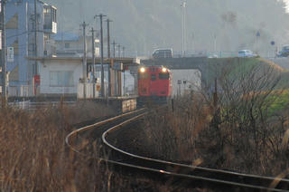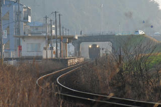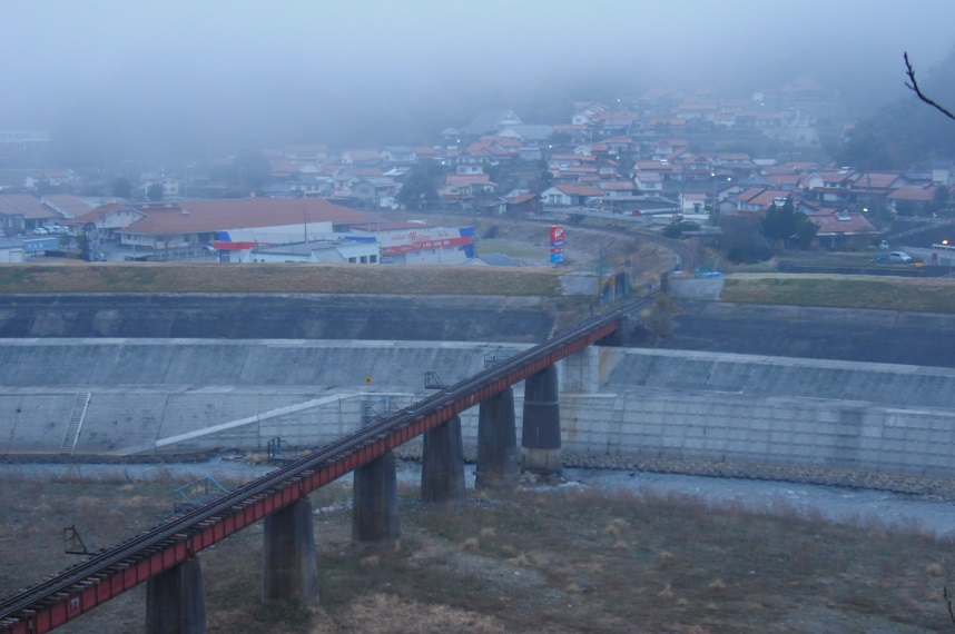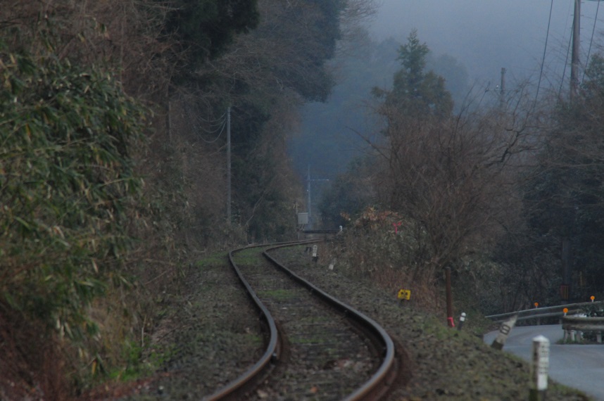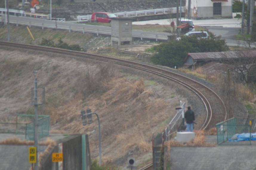 懐かしの通学路を一路因原を目指し走って行く。今回の撮影は弟君が帰省しなければ実現できなかったことだ。実家の車は僕が運転すると保険がきかないのだ。いかに田舎道とはいえ保険なしの状態(自賠責は当然入っているんだが)では怖くてとても運転できない。その点、弟君の車はだれが運転しても保険がきくので非常に助かる。走りながら道端の気温計の表示を見るとなんと氷点下4度。地面が濡れてないからいいものの濡れてたら凍結してるだろう。40~50分くらいかかるかと思ったら30分足らずであっけなく目的地の八重山神社に到着。ロケハンのためそのまま川沿いの細い道を進む。対向するのにも苦労しそうな細い道だ。あらかじめ三次行きはここで撮ろうという目星をつけておいた場所を実際に確認し、今度はメインの撮影となる浜田行きの撮影地、八重山神社へと向かう。車を停め、踏切横の道から丘の上へと登って行く。すぐ横の民家のワンちゃんにえらい剣幕で吠えられまくる。周囲はまだ薄暗くまったくひと気もないので少々気味が悪い。しかしそんなことは言ってられないので我慢して上へ上へと登って行った。