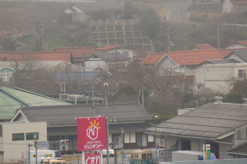 まずは望遠でぱちり!!!昨日の東海道線の中ではこの赤い看板&店舗がまだ建っていない頃の素朴な石州瓦の家々をバックに走る写真を見ていただけに「残念!!!」の一言。完全にこちらサイドの自己中な恨み言になってしまうが言わせてもらおう!!!ウェルネスさん、何てことしてくれたんだ!!!ついでに見切れてるおっちゃん、あんたもだ。