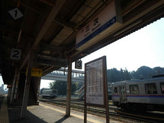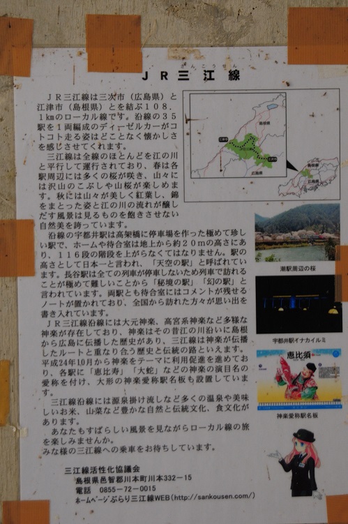 三江線が意外と実家の近くを走っていたと知ったのは自動車学校に通うようになってから。僕は島根の自動車学校に通ったんだが教習で何度かこの線路沿いを走った。その時は「へぇ~こんなところを走ってるんだ」とちょっと感動したもんだ。その後、一度三次から江津まで乗り通した。多分大学2年に上がる春だったと思う。その時は乗り換えなしで三次から江津まで行けたからそういうダイヤだったんだなぁ。今は朝5時38分発の列車以外に三次から直通する列車はない。ちなみにその時は江津から山陰線をえっちらおっちら乗り継いで鳥取まで行き、そこから今は亡き夜行の急行だいせんで大阪まで行ったような気がする・・・けど記憶がおぼろげだ。当時の写真を引っ張り出せばはっきりするだろうけど今は手元にない・・・。