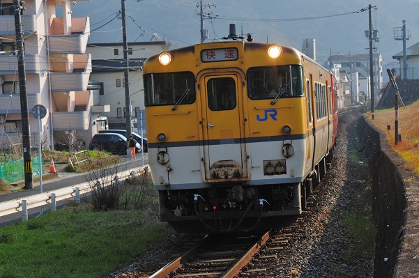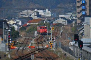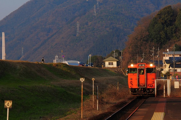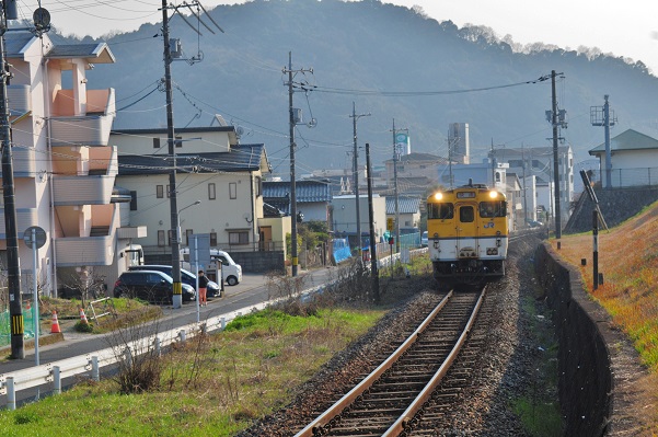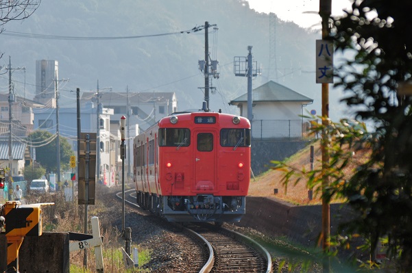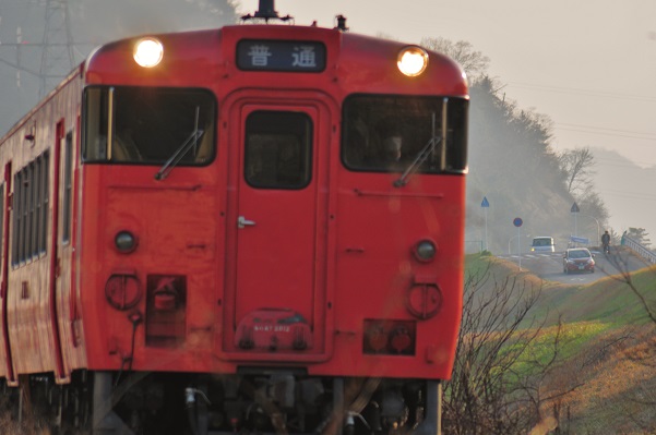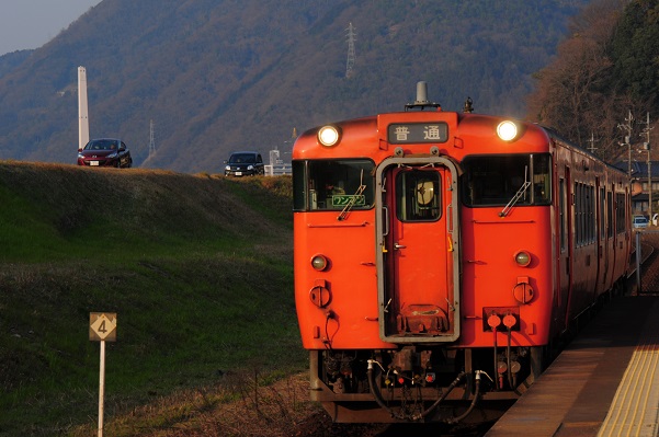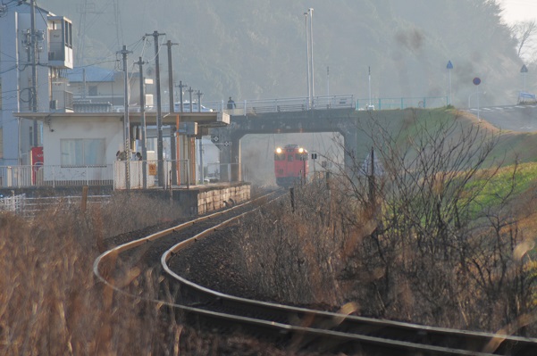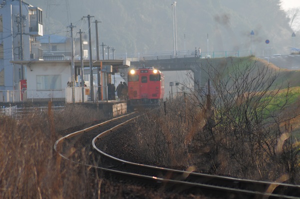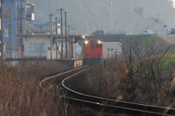 駅に向かいがてら最後の最後の列車を撮影すべくカメラを構える。このまま駅に向かっても三次方面の列車の後に広島行きの列車が来る。道路をアンダークロスするあのポイントが行くか行くまいか迷っていたポイントだ。でもあっちじゃなくてこっちに専念してよかった。あっちに行ってたら1本トンネル側の列車を撮り損ねていたかもしれん。