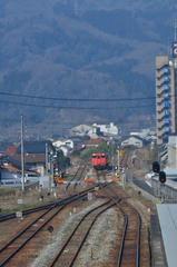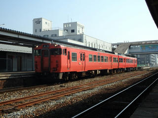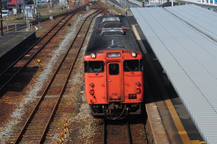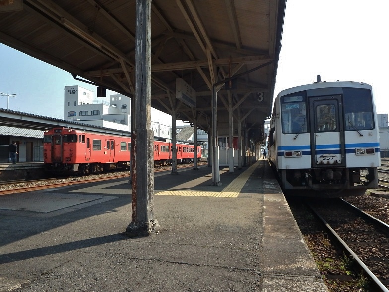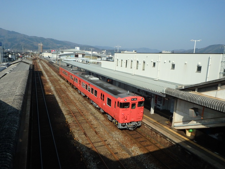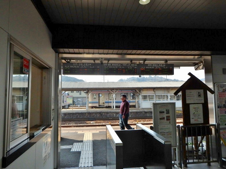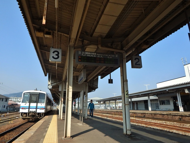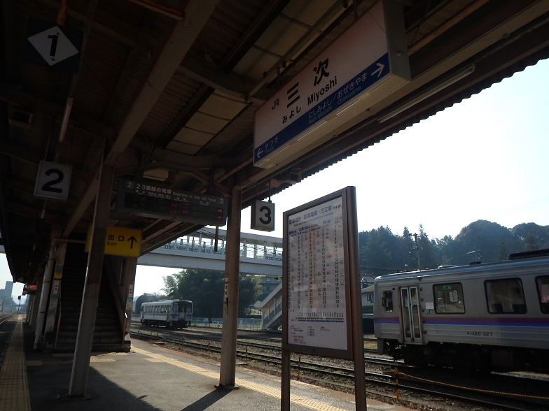 同じホームの向かい側に列車が入ってきた。芸備線の下り列車である・・・と思ったら福塩線の下り列車であった。府中発の三次行き。三次着9時58分の列車である。くそぉ~こんなのもあったのか。だったらさっきの塩町方面のアングルで撮影できたではないか!!!しくじったなぁ~。正直三江線の発車時刻しか調べてないからなぁ。僕が乗ってるこの江津からの折り返し列車も三次着の時間を把握していれば撮影できたのに。こんなんトイレなんか行ってる場合じゃなかったな。つーかよく考えたら三次という駅は三江線、芸備線、福塩線という3つの路線が乗り入れる立派なターミナル駅である。まぁどれもこれも一級品のローカル路線だがそれでもこんな中国山地のど真ん中の町によくもまぁ集まったもんだと思う。ただもうすぐ三江線は無くなってしまうけど・・・。
